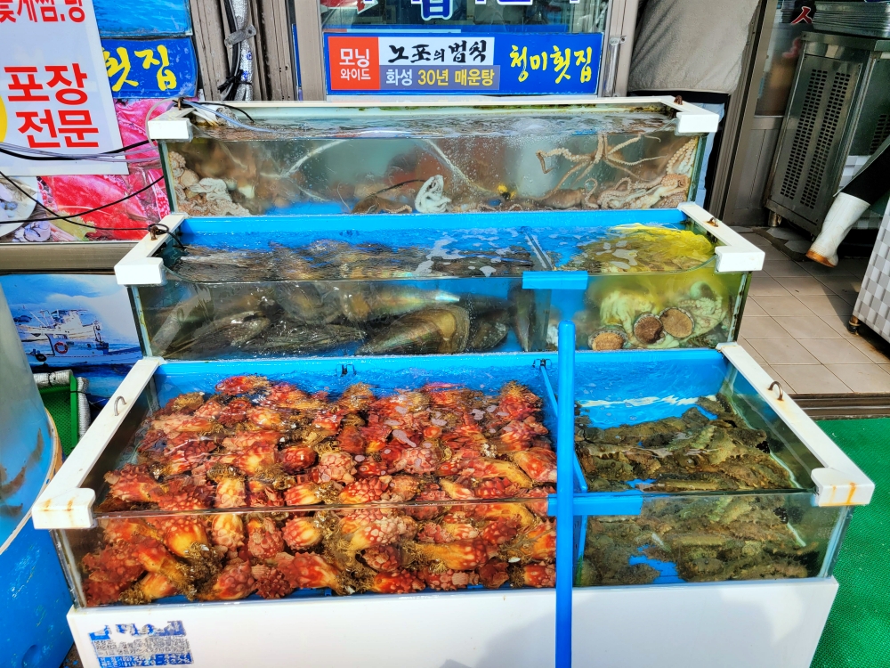 화성 사강시장에 가면 싱싱한 해산물을 바로 구입할 수도 있고 횟집도 여러곳이 있어서 포장주문도 가능하니까 이용해보세요. 대하철도 아직은 끝나지 않았는데 낮부터 대하구이 왕새우 드시는 분들 많이 계시더라구요.
