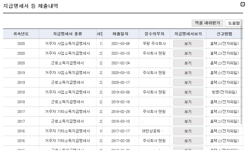 국세청홈택스 로그인 후 My홈택스에 있는 <지급명세서등 제출내역>을 조회하면 근로소득 뿐만 아니라 원천징수 의무자가 제출한 사업소득까지 조회할 수 있습니다.