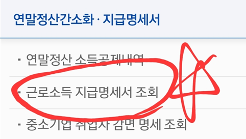 홈택스 가입이 되어 있다면 홈페이지(https://www.hometax.go.kr/) 또는 홈택스 보마일앱인 손택스를 이용해 근로소득원천징수영수증 일명 근로소득 지급명세서를 조회할 수 있습니다. 전 직장 뿐만 아니라 현재직장의 원천공제 된 근로소득지급명세서 내역을 확인할 수 있는데 최근 5년까지의 내역을 조회할 수 있으므로 필요한 서류를 출력해서 은행 또는 연말정산 시 현재 직장에 제출하면 됩니다.